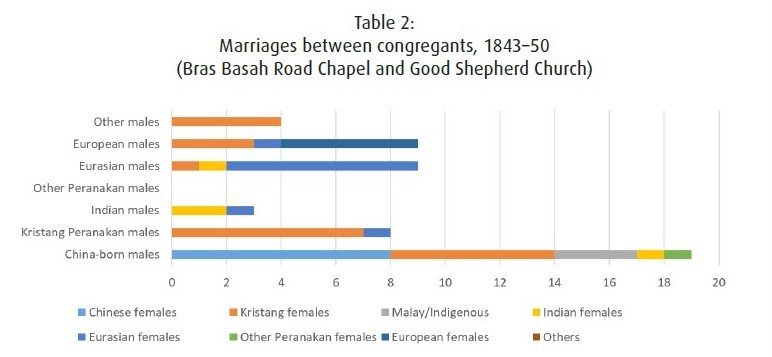 By 1843, the size of the Chinese congregation had grown considerably, possibly approaching or even overtaking the Melaka-born (and now often Singapore-born) Peranakan Kristang community. The number of marriages involving China-born males was more than double that of their Peranakan Kristang counterparts. Of the China-born males, many still married women from the Peranakan Kristang community, but even more formed unions with local-born Chinese women from Singapore, Riau, Lingga and the neighbouring region. In addition, there were a few unions with Malays (possibly orphans), one with a Peranakan woman (possibly Melakan Chinese), and one with an Indian girl from Bengal. Eurasian males began to marry outside their group – one to a Kristang woman and another to an Indian woman. Of the three Indian males married at the church, two married Indian women, and one a Eurasian woman. Unions involving European males seem to have remained relatively diversified.