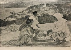 Cai Zhuzhen (蔡竹貞; c. 1900–74) trained at the Shanghai Academy of Art under Liu Haisu. He rarely exhibited his works in the years leading up to the war in Singapore, though his participation was recorded in the 1936 exhibition and the iconic cartoon and photography exhibition in 1938, which had entries by artists in the Malay Archipelago. A rare image of Cai’s work can be found in the 1948 SOCA exhibition catalogue. It depicts an idyllic scene of three Malays on a hilltop overlooking a vast expanse of sea