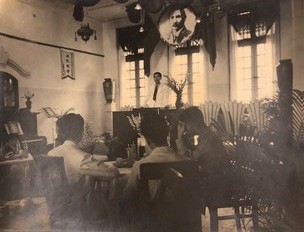 Without a sufficiently large venue in its early years, Mayfair rehearsed in the homes of friends and patrons. By 1938, however, under the patronage of various luminaries, including cinema mogul Run Run Shaw (邵逸夫), Mayfair established its headquarters in two units at the Shaw Brothers’ building on Robinson Road (Figure 11). The premises came with a large hall on the second level. Here, SOCA hosted a send-off-cum-welcome party on 2 November 1939 for Xu Beihong, who was leaving for India, and Yu Shihai (喻世海), a prominent cartoonist who had recently arrived from China.41 A rare photograph of the interior, from the Liu Kang family archives and dated 3 March 1949, captures three men sitting around a table, while Liu, in a white suit, stands on a raised podium under a portrait of Sun Yat-sen, possibly rehearsing a speech (Figure 12).42
