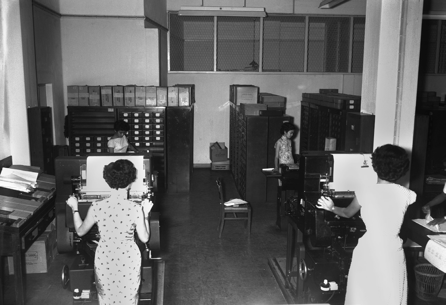 Figure 1 offers a glimpse of the operations of the Powers-Samas accounting machines at the Singapore Statistics Department, which appears to have been staffed entirely by women. In the photo, two operators, with their backs to the camera, have their hands pressed against the machines as they look intently at the paper reels in front of them. Facing them are two other women focused on their machines. Owing to their being featured in local newspaper stories for their work in compiling census data, women became increasingly associated with mechanised data processing in the 1950s and 1960s.22