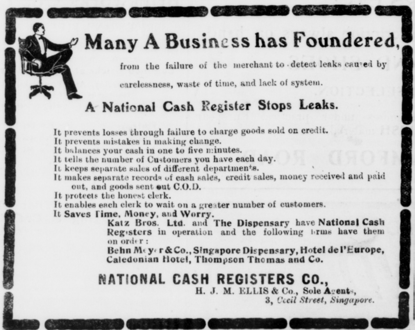 NCR cash registers were first marketed together with other American products under Ellis & Co. in the 1900s. “Page 64/65 Advertisements Column 1,” Straits Times Annual, 1 January 1906, 64 (From NewspaperSG). One of the distribution agents in the 1910s was the Wadleigh Company, set up in 1914 to “deal principally between rubber planters in Malaya and the consumers in New York”. This suggests that there was demand in the rubber industry for such machines. “National Cash Register Agency,” Malaya Tribune, 11 May 1914, 10. (From NewspaperSG) ↩