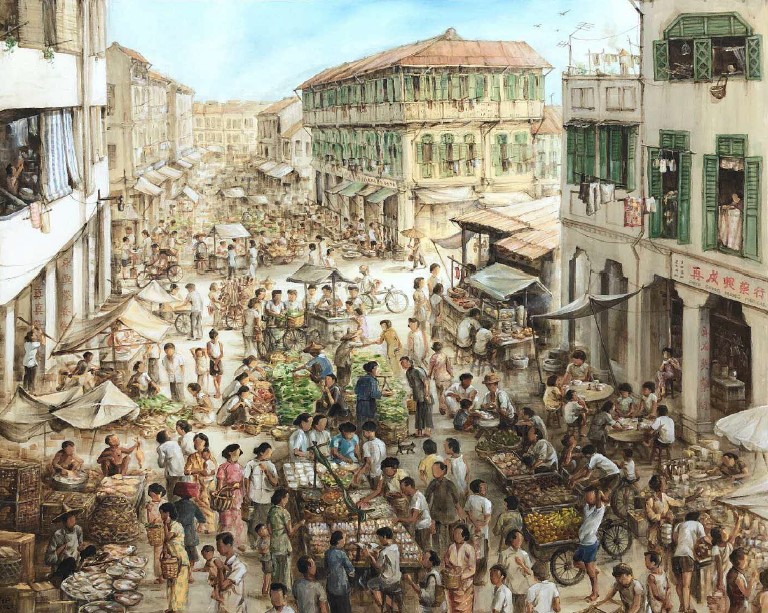 A wet market on Trengganu Street, Chinatown, c. 1960. In the background is the former Lai Chun Yuen Opera House. Tan Kok Kheng Collection, courtesy of National Archives Singapore (Media - Image no. 19980005922 - 0089).In works like “Trengganu Street Market”, Yip drew from his own memories growing up in Chinatown. However, in other works, archival research and old photographs play a bigger role. In “Preparing for the Haj” (2020), the canvas captures a cross-section of Bussorah Street bustling with activities surrounding the Haj preparations, with the grand Masjid Sultan (Sultan Mosque) in the background.6