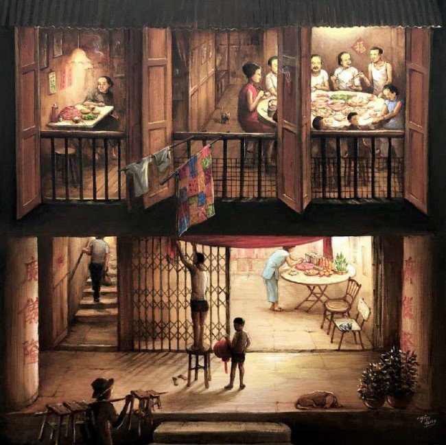 Some of his paintings also weave in tiny personal stories. His 2019 painting, “New Year’s Eve”, depicts an older woman waiting alone in her room while Yip’s family enjoys a reunion gathering in the adjoining room – a deliberate and sharp contrast highlighting isolation amid celebration.