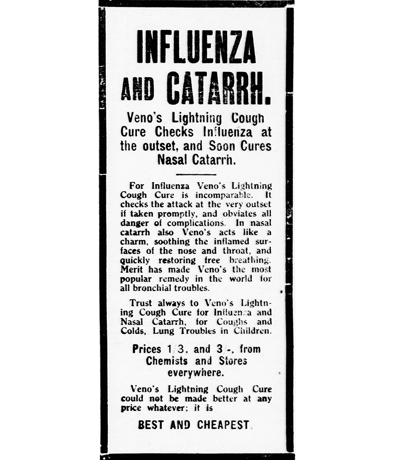 Opportunistic companies took advantage of the widespread fear and uncertainty among the people to frame their products as cures for symptoms of influenza and related illnesses in newspaper advertisements. Prior to the pandemic, Veno’s Lightning Cough Cure had only been marketed as a remedy for coughs. However, an advertisement in the Singapore Free Press and Mercantile Advertiser on 6 November 1918 proclaimed that “Veno’s Lightning Cough Cure Checks Influenza at the outset”.32
