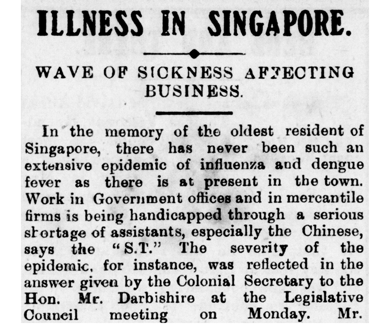 “Illness in Singapore”. “The Mysterious Malady”. “Disease Gradually Spreading in Singapore”. These are not newspaper reports on the Covid-19 pandemic in 2020. Instead, these are headlines that appeared over a century ago in local newspapers about the influenza pandemic, which gripped Singapore and the world in 1918.1