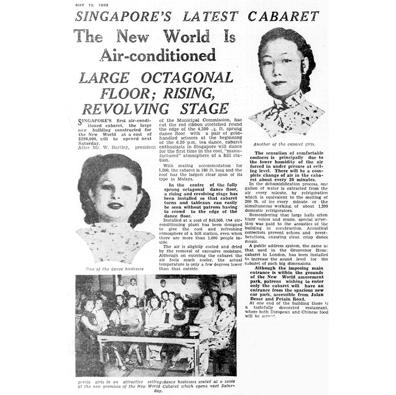 Before long, other entertainment spots in Singapore began incorporating air conditioning into their design as a marketing ploy. In 1938, the New World amusement park, which had opened in 1923, advertised its air-conditioned Dance Palace where patrons could “Dance in Perpetual Coolness”.13 Costing $48,500, the Straits Times wrote that the “air-conditioning plant has been designed to give the cool and refreshing atmosphere of a hill station, even when there are more than 1,000 people inside”.14