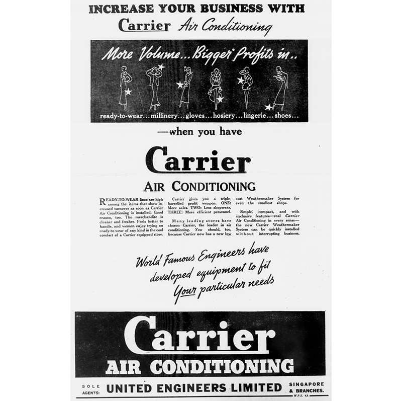 Air conditioning first came to Singapore in the 1920s and the largest supplier of the technology during the inter-war era was the Carrier Air Conditioning Company of America. Carrier entered the Asian market in the early 1930s, subsequently setting up a regional headquarters in Singapore alongside Tokyo, Hong Kong and Sydney.3