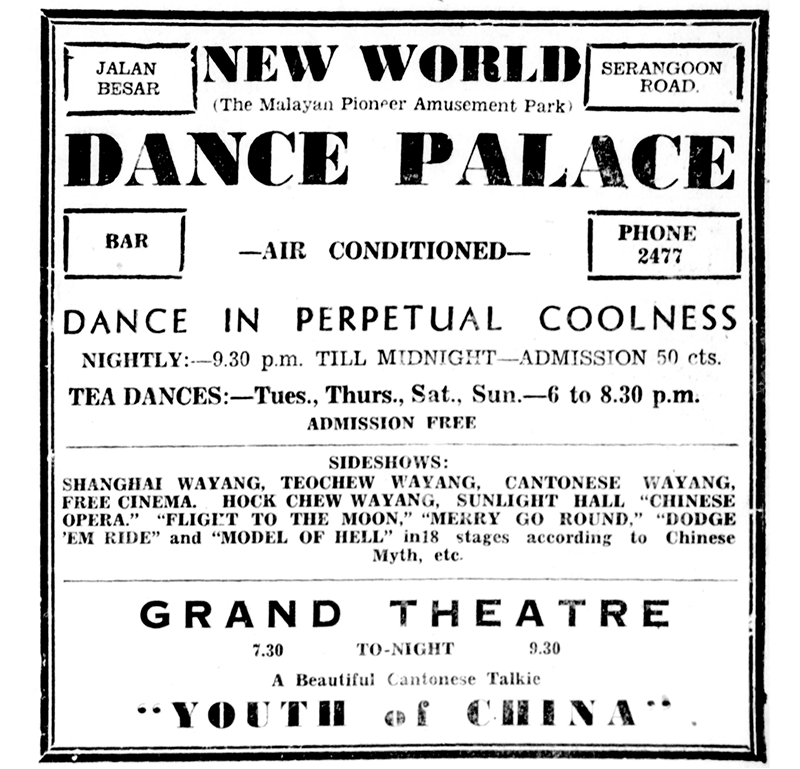 “Page 7 Advertisements Column 2: New World Dance Palace,” Morning Tribune, 28 July 1938, 7. (From NewspaperSG); Wong Yunn Chii and Tan Kar Lin, “Emergence of a Cosmopolitan Space for Culture and Consumption: The New World Amusement Park-Singapore (1923–70) in the Inter-War Years,” Inter-Asia Cultural Studies 5, no. 2 (2004): 279–304, https://www.tandfonline.com/doi/abs/10.1080/1464937042000236757. ↩