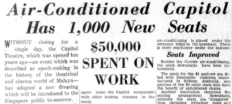 Bonny Tan, “Living It Up at the Capitol,” BiblioAsia 13, no. 4 (January–March 2018), 16–21; “Air-Conditioned Capitol Has 1,000 New Seats,” Straits Times, 31 January 1940, 15. (From NewspaperSG) ↩